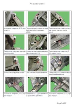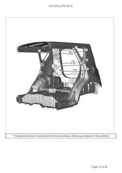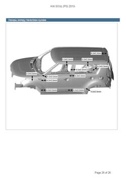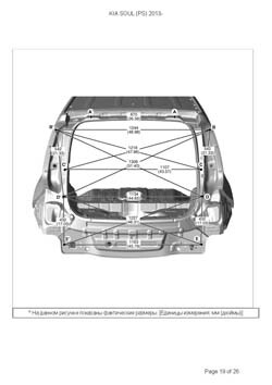 - Из заводского руководства по ремонту кузова KIA Soul (PS) 2013-2019, в том числе диагональные размеры проемов кузова и контрольные точки для восстановления геометрии. Дополнительно приведены допустимые значения зазоров кузовных панелей.