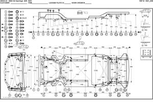 - Проекционные геометрические размеры кузова с привязкой к стапелю. Дополнительно приведены цветные фотографии мест расположения контрольных точек KIA Sorento на реальном автомобиле.