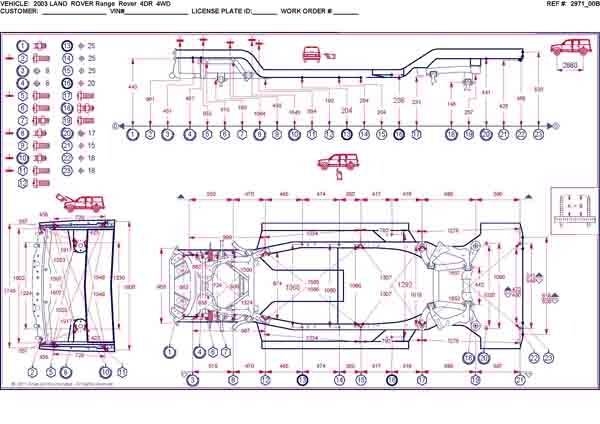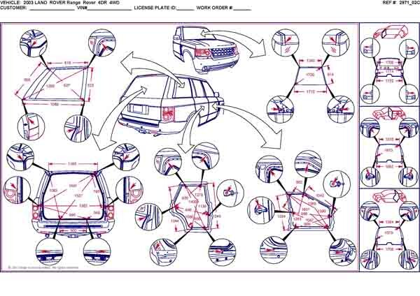 - Геометрические размеры кузова LAND ROVER Range Rover 3, как проекционные, так и непосредственного измерения, в том числе диагональные размеры проемов кузова и контрольные точки для восстановления геометрии.