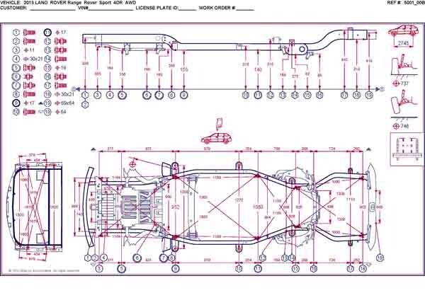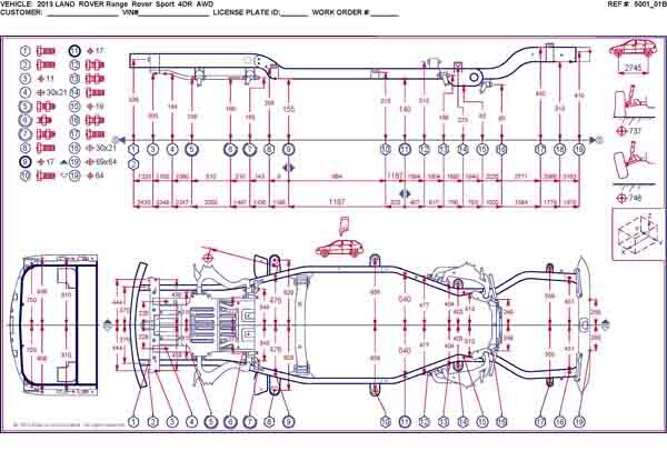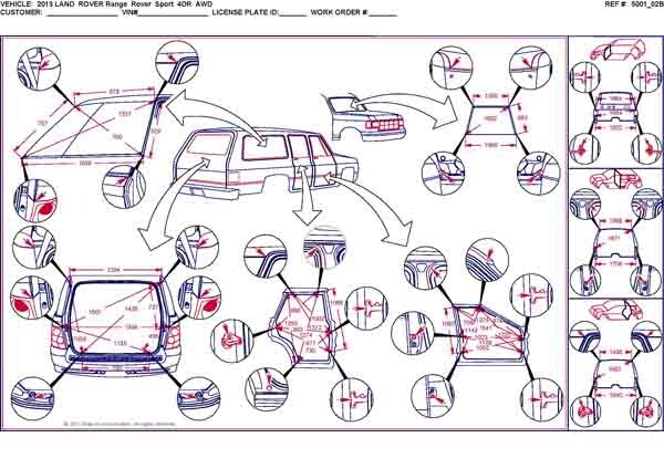 - Геометрические размеры кузова LAND ROVER Range Rover Sport 2005-2013, как проекционные, так и непосредственного измерения, в том числе диагональные размеры проемов кузова и контрольные точки для восстановления геометрии.