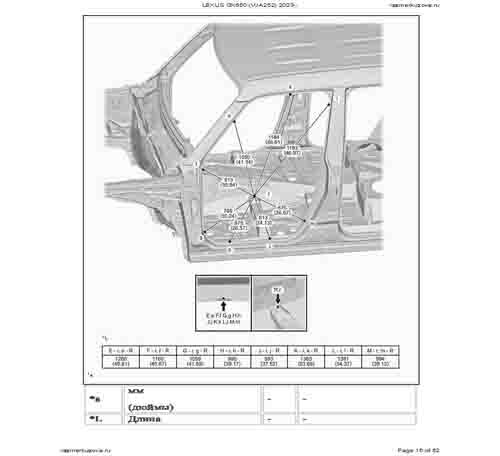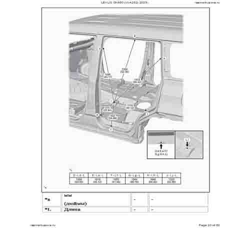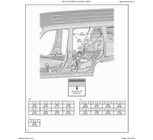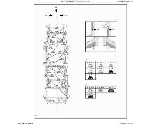Контрольные кузовные размеры из официального руководства по ремонту кузова LEXUS GX550 (VJA252) 2023--, в том числе диагональные размеры проемов кузова и контрольные точки для восстановления геометрии.