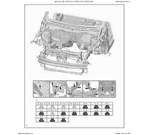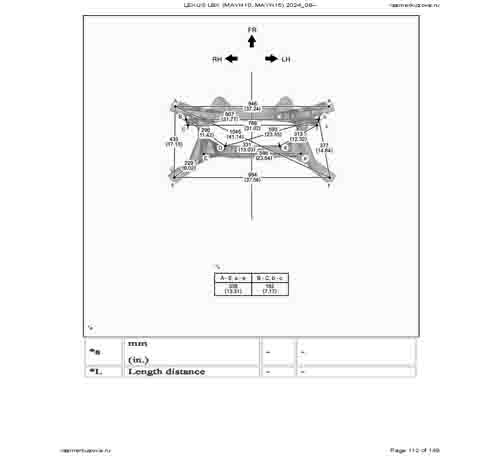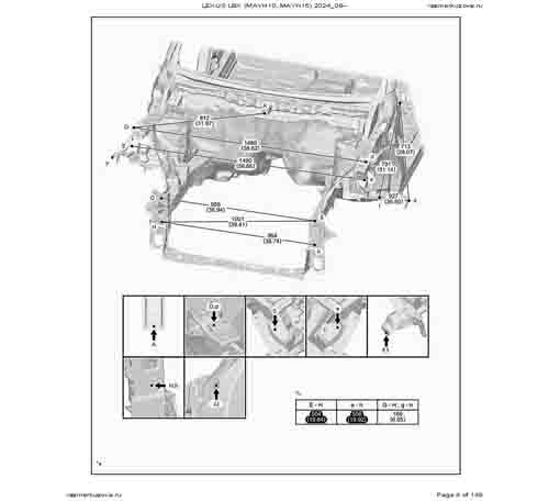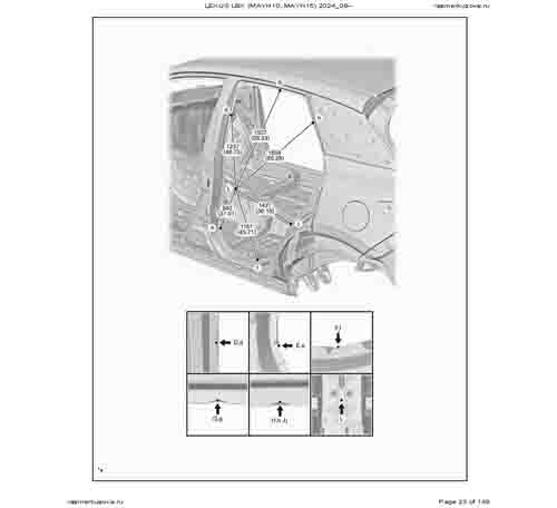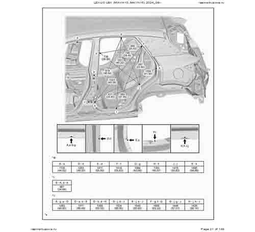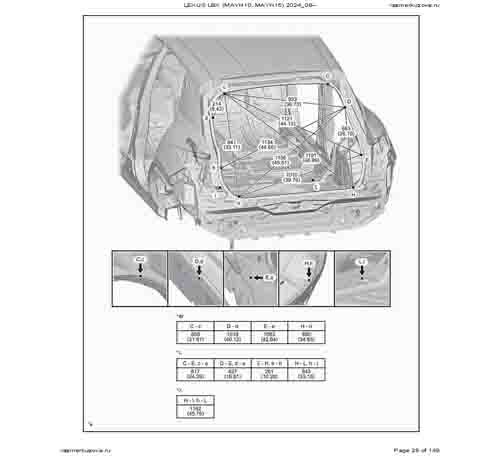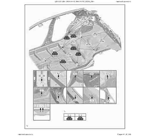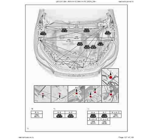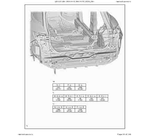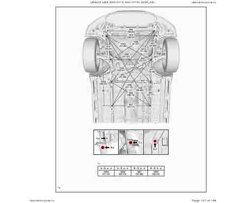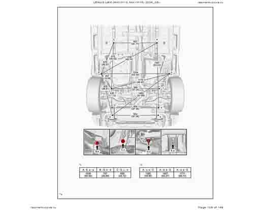 Контрольные кузовные размеры из официального руководства по ремонту кузова LEXUS LBX (MAYH10, MAYH15) 2023--, в том числе диагональные размеры проемов кузова и контрольные точки для восстановления геометрии.