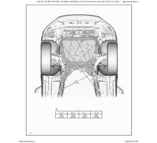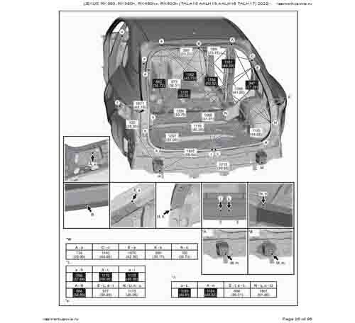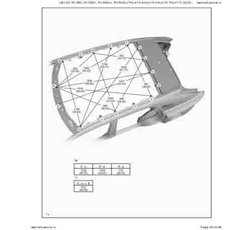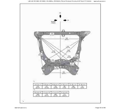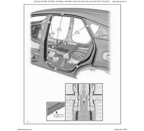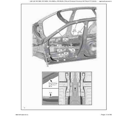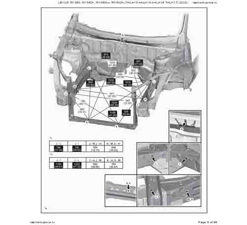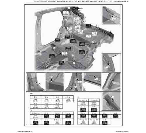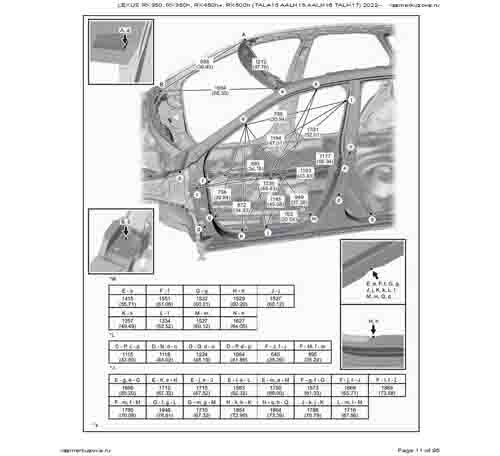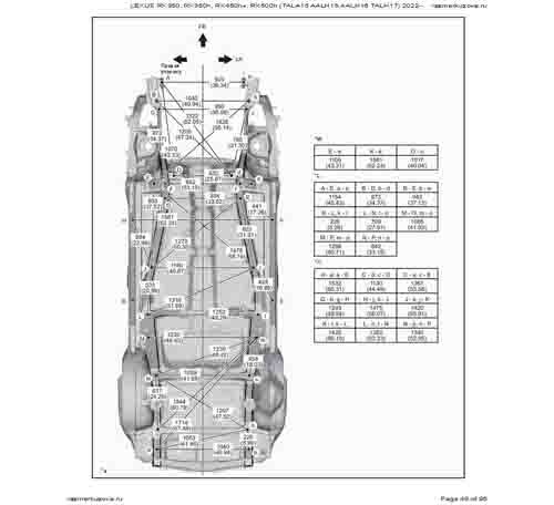 Контрольные кузовные размеры LEXUS RX 5-го поколения из официального руководства по ремонту кузова LEXUS RX350, RX350h, RX450h+, RX500h (TALA15, AALH15, AALH16, TALH17) 2022--, в том числе диагональные размеры проемов кузова и контрольные точки для восстановления геометрии.