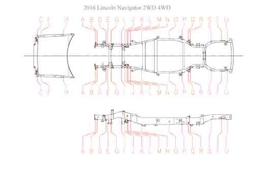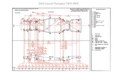 - Геометрические размеры кузова LINCOLN Navigator 2014-2017, как проекционные, так и непосредственного измерения, в том числе диагональные размеры проемов кузова и контрольные точки для восстановления геометрии кузова.