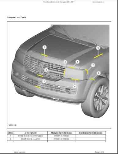 Контрольные кузовные размеры LINCOLN Navigator 2014-2017 из официального руководства по ремонту кузова. В том числе диагональные размеры проемов кузова и контрольные точки для восстановления геометрии кузова. Дополнительно приведены допустимые значения зазоров кузовных панелей.