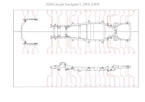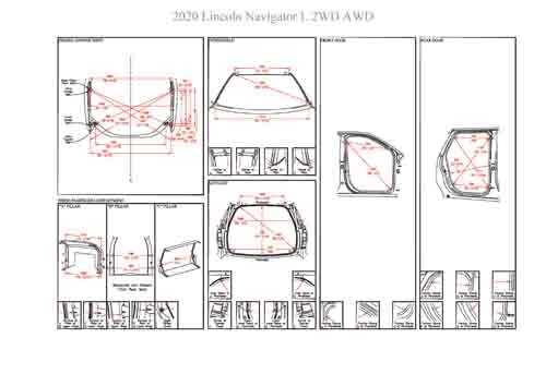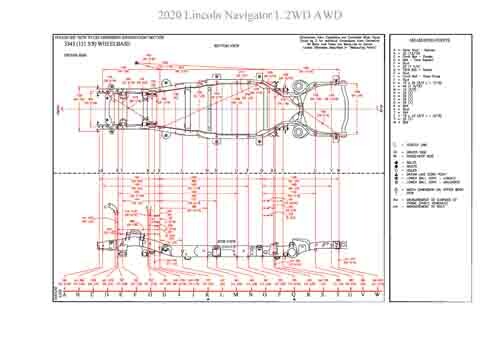 - Геометрические размеры кузова LINCOLN Navigator L 2017--, как проекционные, так и непосредственного измерения, в том числе диагональные размеры проемов кузова и контрольные точки для восстановления геометрии кузова.