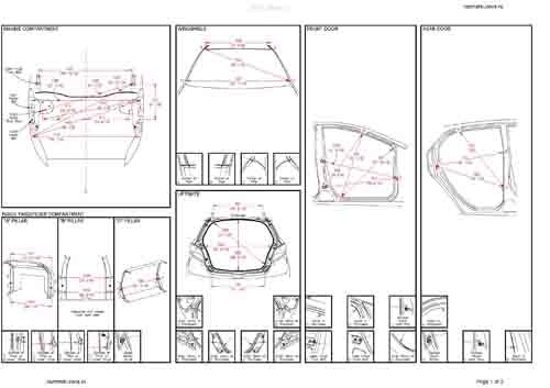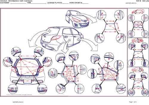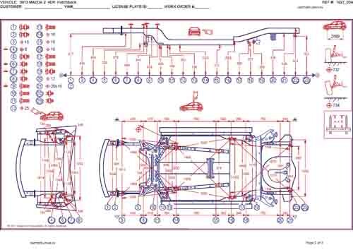 - Геометрические размеры кузова MAZDA 2 (DE) 2007-2014, как проекционные, так и непосредственного измерения, в том числе диагональные размеры проемов кузова и контрольные точки для восстановления геометрии кузова.