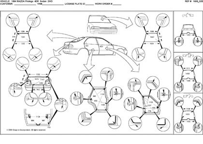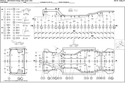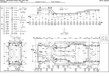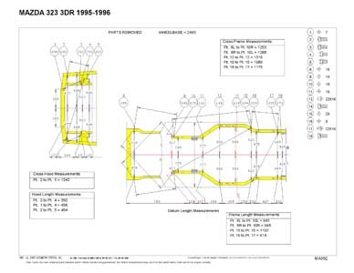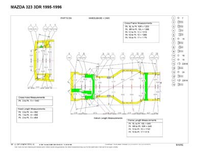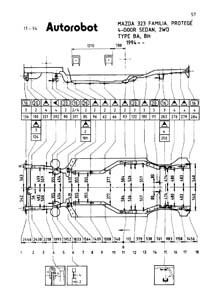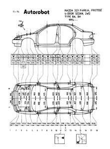 - Проекционные геометрические размеры кузова Mazda 323 с привязкой к стапелю.