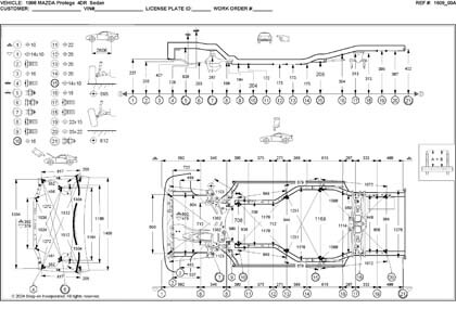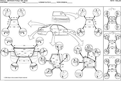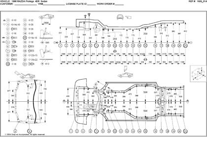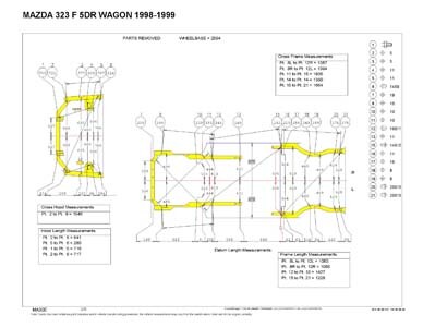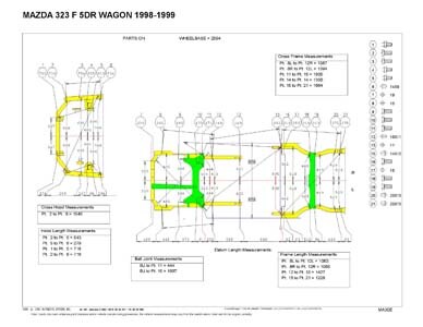 - Проекционные геометрические размеры кузова Mazda 323 с привязкой к стапелю.