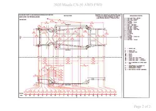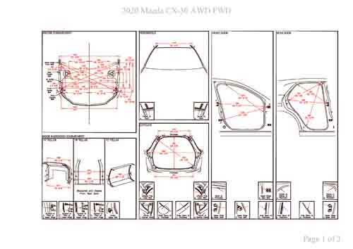 - Геометрические размеры кузова MAZDA CX-30 (DM) 2019--, как проекционные, так и непосредственного измерения, в том числе диагональные размеры проемов кузова и контрольные точки для восстановления геометрии кузова.