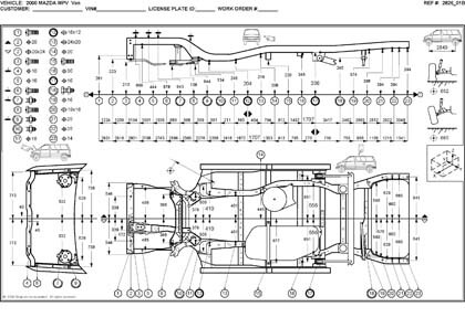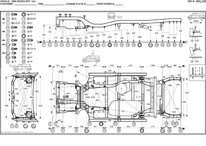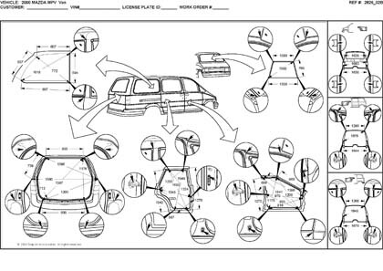 - Геометрические размеры, как проекционные, так и непосредственного измерения, в том числе диагональные размеры проемов кузова и контрольные точки для восстановления геометрии кузова Mazda MPV.