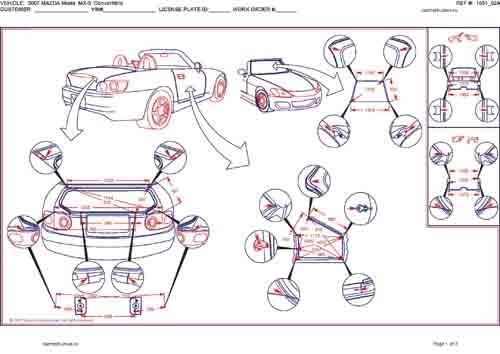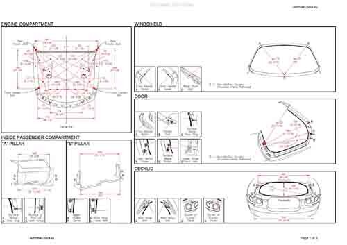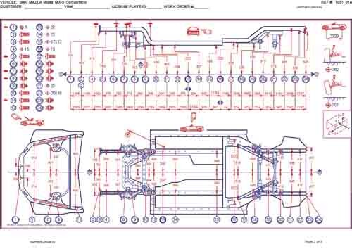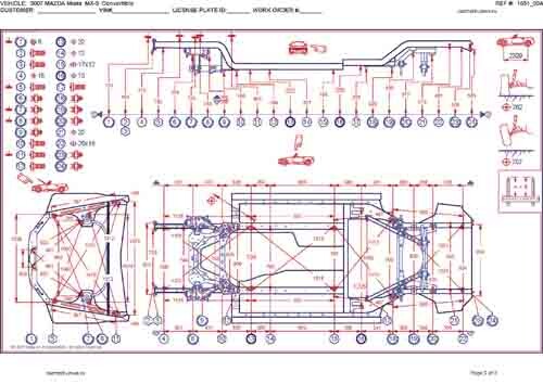 - Геометрические размеры кузова MAZDA MX-5 (NC) 2005-2008-2015, как проекционные, так и непосредственного измерения, в том числе диагональные размеры проемов кузова и контрольные точки для восстановления геометрии кузова.