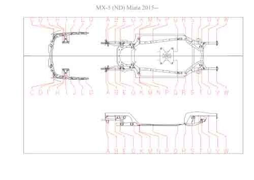 - Геометрические размеры кузова MAZDA MX-5 (ND) Miata 2015--, как проекционные, так и непосредственного измерения, в том числе диагональные размеры проемов кузова и контрольные точки для восстановления геометрии кузова.