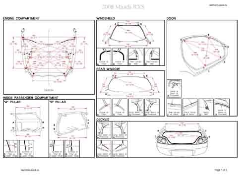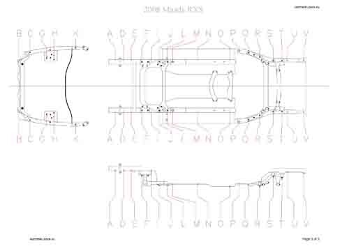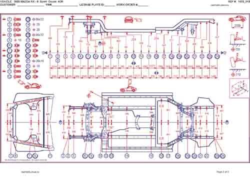 - Геометрические размеры кузова MAZDA RX-8 2003-2008-2012, как проекционные, так и непосредственного измерения, в том числе диагональные размеры проемов кузова и контрольные точки для восстановления геометрии кузова.