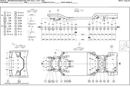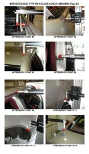 - Проекционные размеры с привязкой к стапелю. Дополнительно приведены цветные фотографии мест расположения контрольных точек на реальном автомобиле.