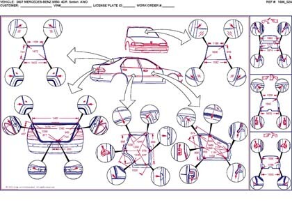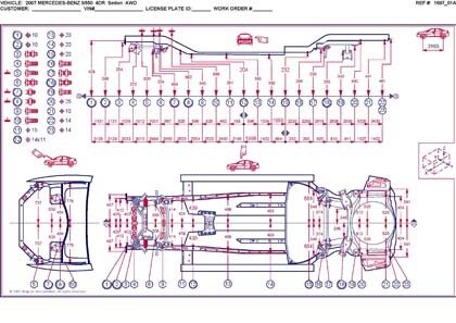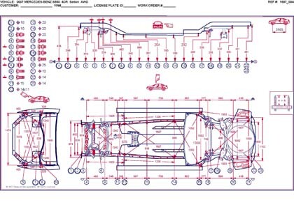 - Проекционные размеры с привязкой к стапелю. Дополнительно приведены цветные фотографии мест расположения контрольных точек на реальном автомобиле.