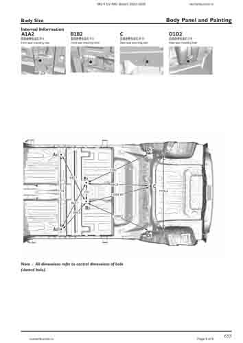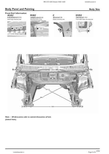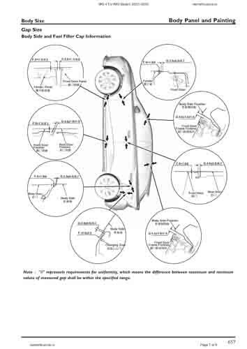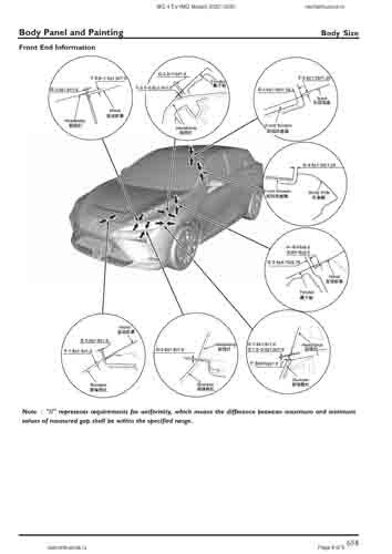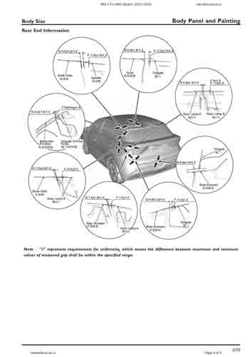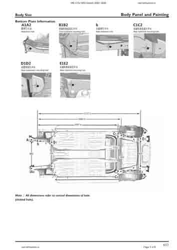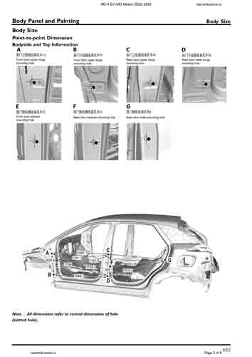 Контрольные размеры кузова для автомобилей MG 4 EV (MG Mulan) 2022–2025 из заводского руководства по ремонту кузова, в том числе размеры проемов кузова. Дополнительно приведены сведения о допустимых зазорах кузовных панелей.