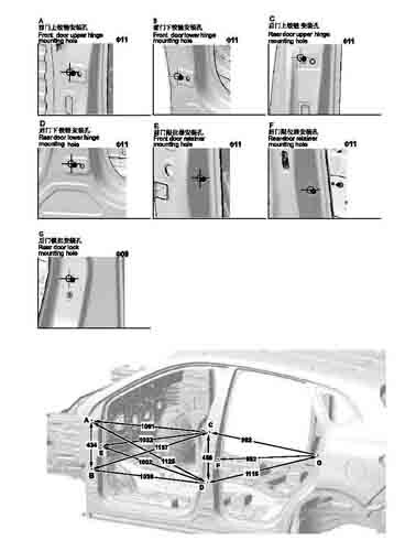 Контрольные размеры кузова для автомобилей MG HS (AS23) (China, facelift) 2022-- из заводского руководства по ремонту кузова, в том числе размеры проемов кузова. Дополнительно приведены сведения о допустимых зазорах кузовных панелей.