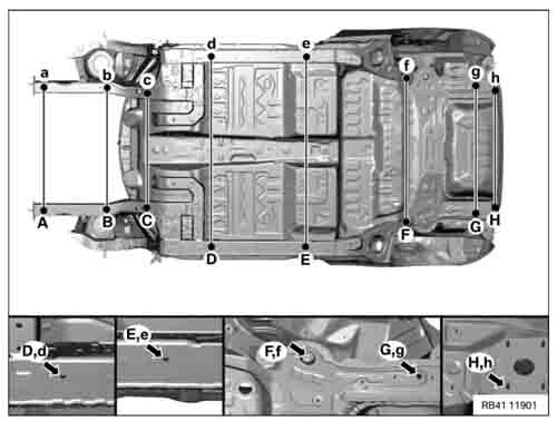Контрольные кузовные размеры из официального руководства по ремонту кузова MINI Cooper Hatch (J01) 2023--. Дополнительно приведены величины зазоров кузовных панелей.