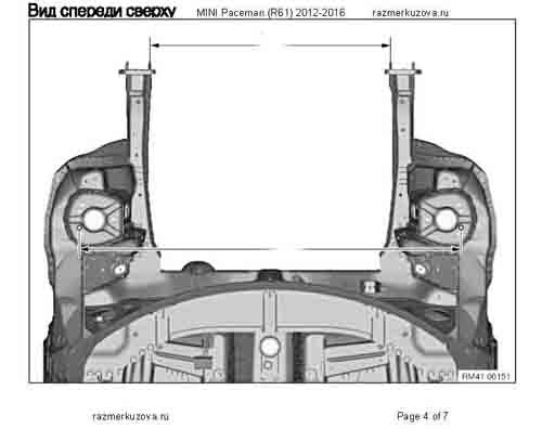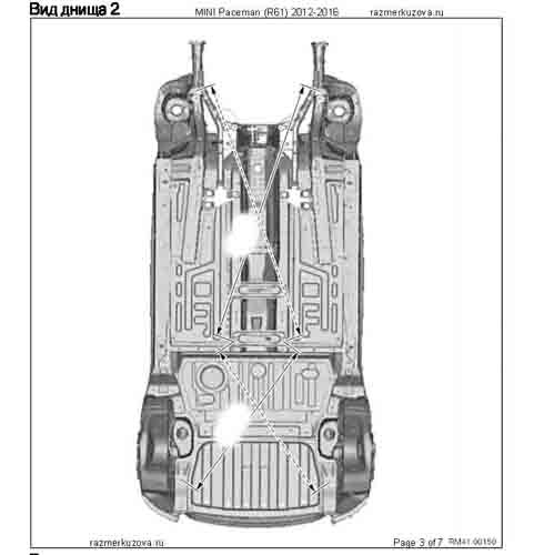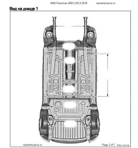 Контрольные кузовные размеры из официального руководства по ремонту кузова MINI Paceman (R61) 2012-2016. Дополнительно приведены величины зазоров кузовных панелей. Пояснения к чертежам автоматически переведены на русский язык.