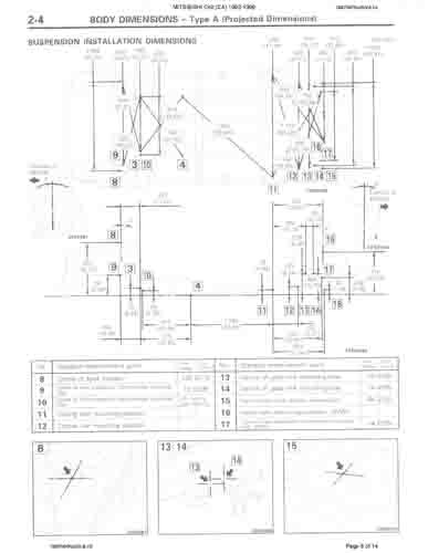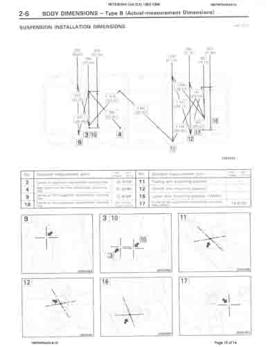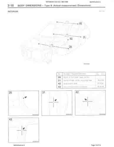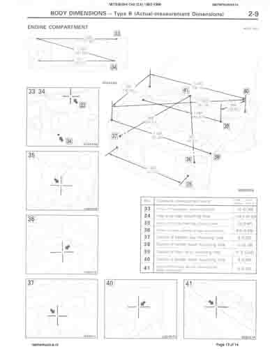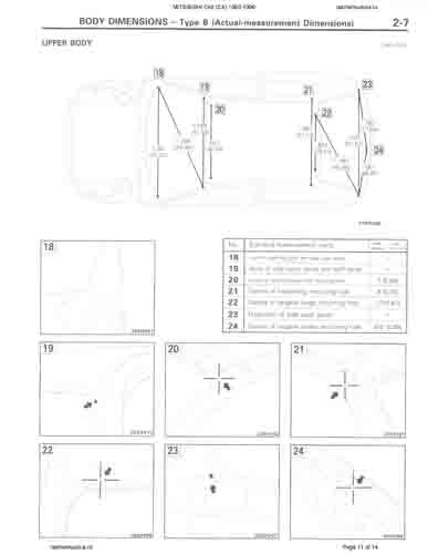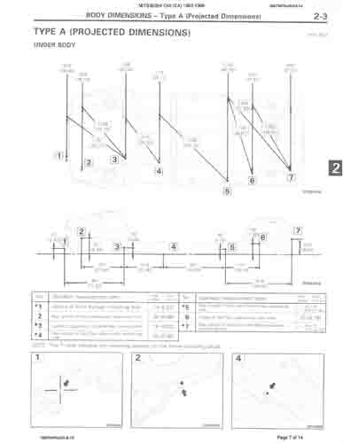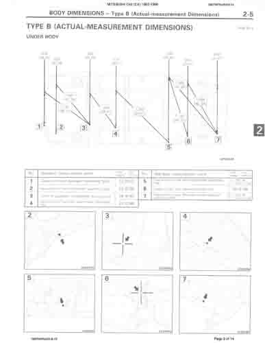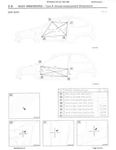 Контрольные кузовные размеры MITSIBISHI Colt (CA) 1992-1996 из официального руководства по ремонту кузова, как проекционные, так и непосредственного измерения, в том числе диагональные размеры проемов кузова и точные места расположения контрольных точек.