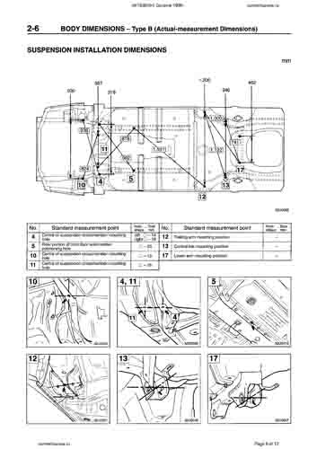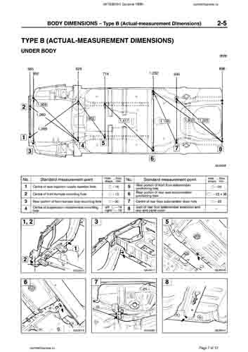 Контрольные кузовные размеры MITSUBISHI Carisma (DA) 1995-1999-2004 из официального руководства по ремонту кузова, как проекционные, так и непосредственного измерения, в том числе диагональные размеры проемов кузова и точные места расположения контрольных точек.