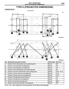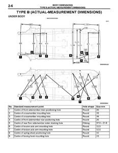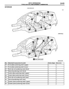 - Проекционные размеры с привязкой к стапелю. Дополнительно приведены цветные фотографии мест расположения контрольных точек на реальном автомобиле.