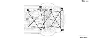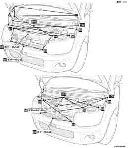 Контрольные кузовные размеры MITSUBISHI Delica D5 (CV#) 2007-2018 из заводского руководства по ремонту кузова, в том числе диагональные размеры проемов кузова и точные места расположения контрольных точек. Пояснения в документации выполнены на японском языке.