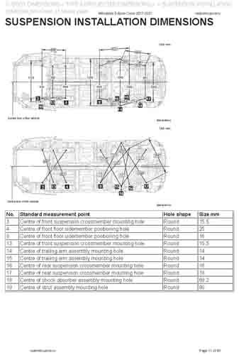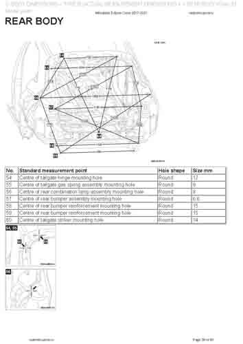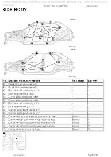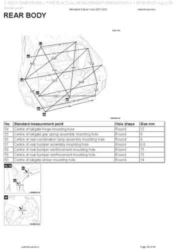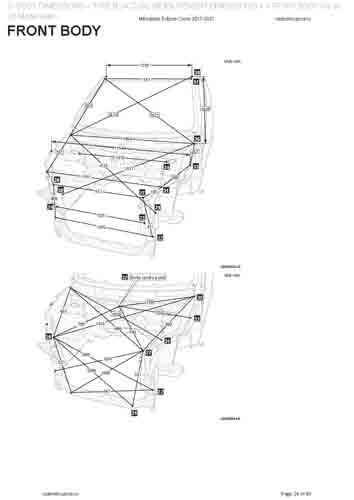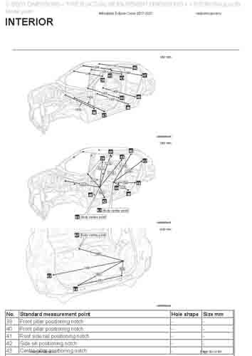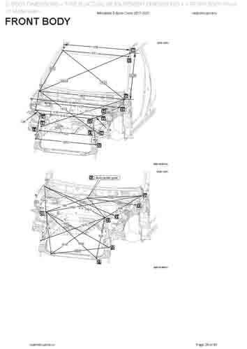 - Геометрические размеры кузова MITSUBISHI Eclipse Cross 2017-2020--, как проекционные, так и непосредственного измерения, в том числе диагональные размеры проемов кузова и контрольные точки для восстановления геометрии кузова.