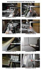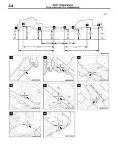 - Проекционные размеры с привязкой к стапелю. Дополнительно приведены цветные фотографии мест расположения контрольных точек на реальном автомобиле.