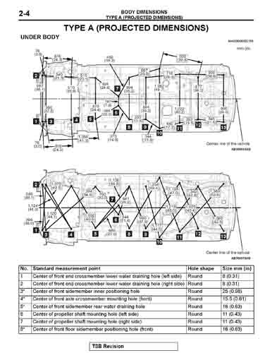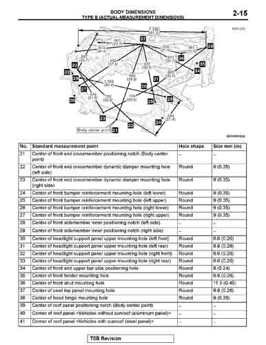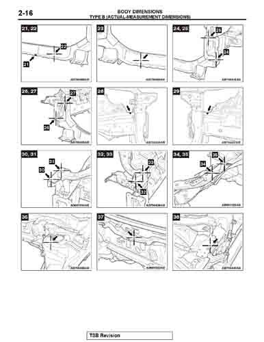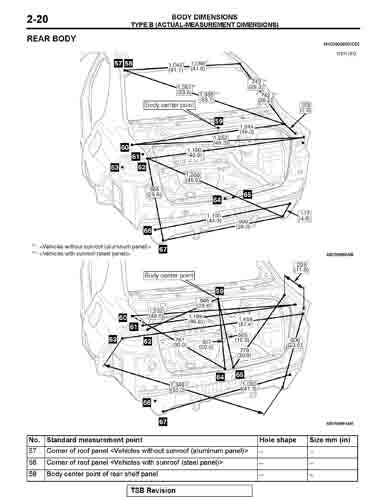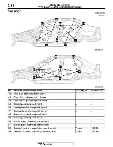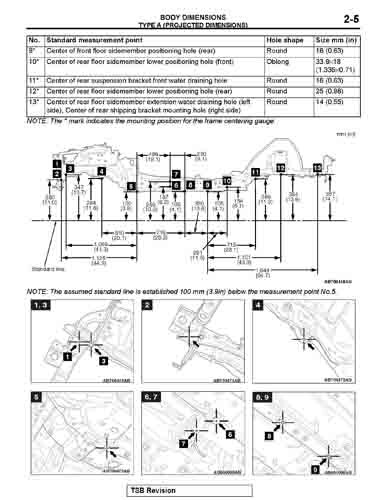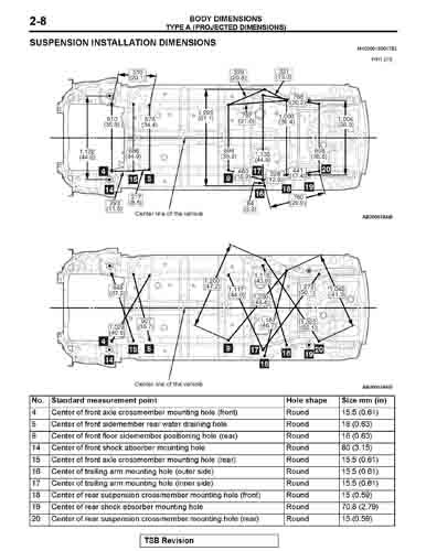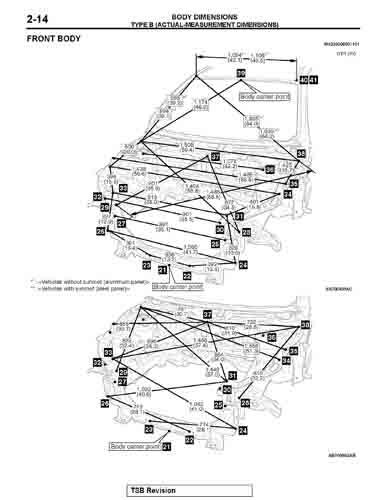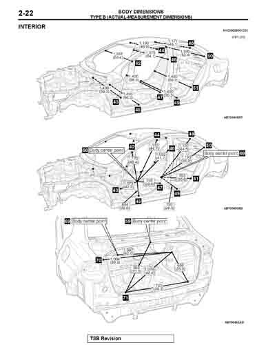 Контрольные кузовные размеры MITSUBISHI Lancer Evolution из официального руководства по ремонту кузова, в том числе диагональные размеры проемов кузова и точные места расположения контрольных точек.
