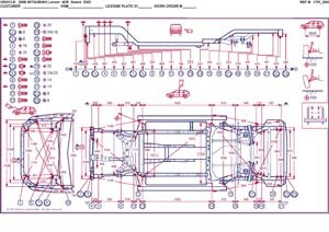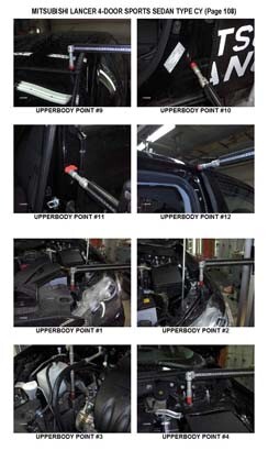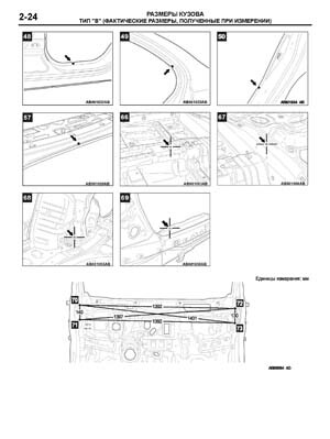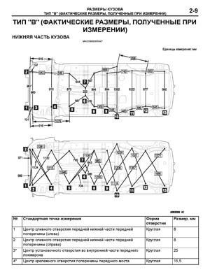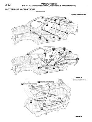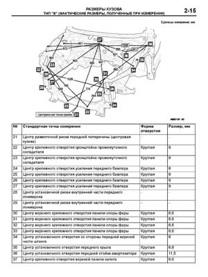 - Проекционные размеры с привязкой к стапелю. Дополнительно приведены цветные фотографии мест расположения контрольных точек на реальном автомобиле.