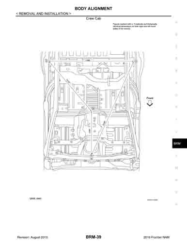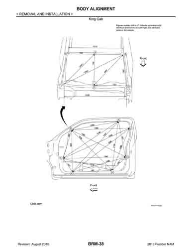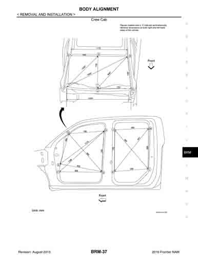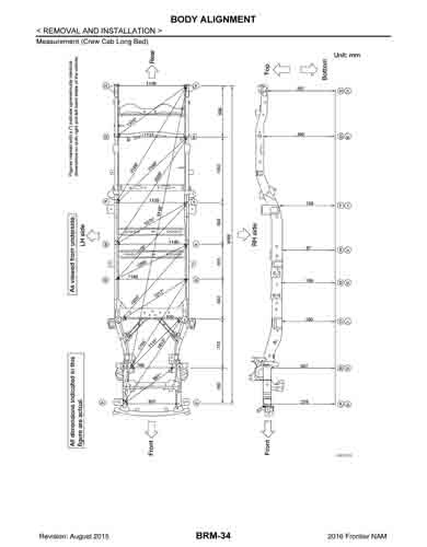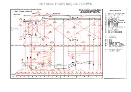 - Геометрические размеры кузова NISSAN Frontier (D40) 2004-2021, как проекционные, так и непосредственного измерения, в том числе диагональные размеры проемов кузова и контрольные точки для восстановления геометрии кузова.