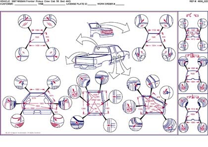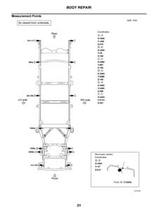 - Проекционные размеры с привязкой к стапелю. Дополнительно приведены цветные фотографии мест расположения контрольных точек на реальном автомобиле.