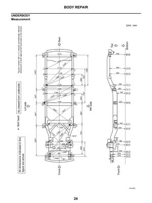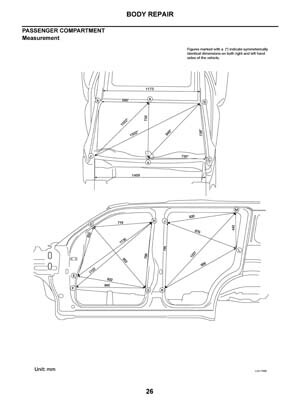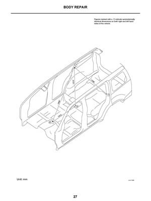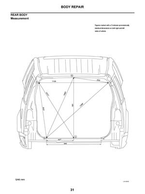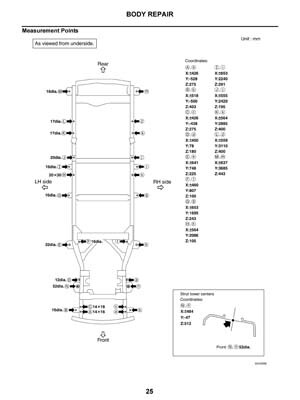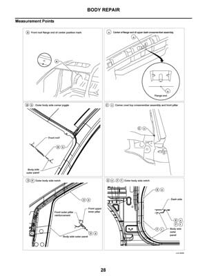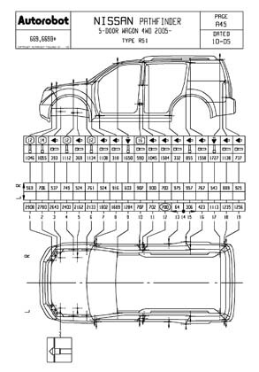 - Из заводского руководства по ремонту кузова Nissan Pathfinder Body Repair Manual, в том числе диагональные размеры проемов кузова и контрольные точки геометрии кузова Ниссан Пасфайндер.