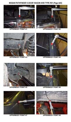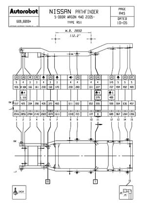 - Проекционные размеры с привязкой к стапелю. Дополнительно приведены цветные фотографии мест расположения контрольных точек Ниссан Пасфайндер на реальном автомобиле.