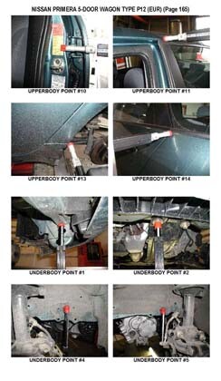 - Проекционные размеры с привязкой к стапелю. Дополнительно приведены цветные фотографии мест расположения контрольных точек Ниссан Примьера на реальном автомобиле.