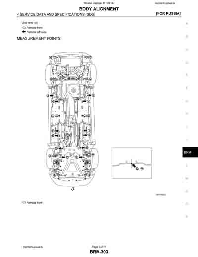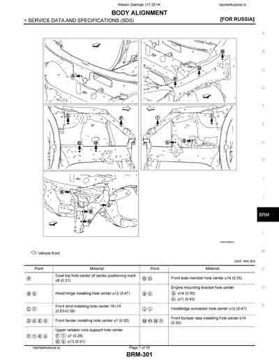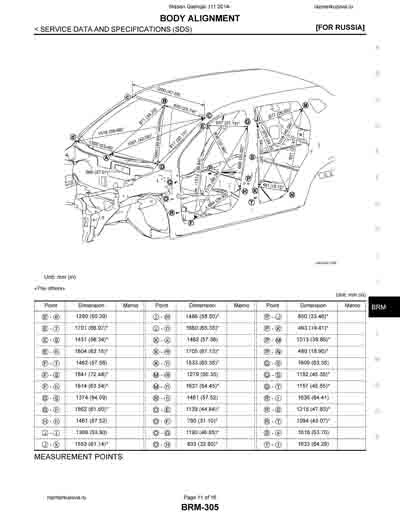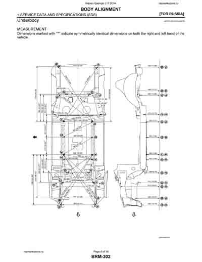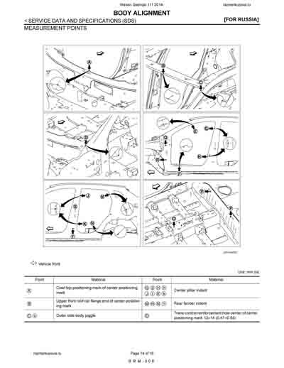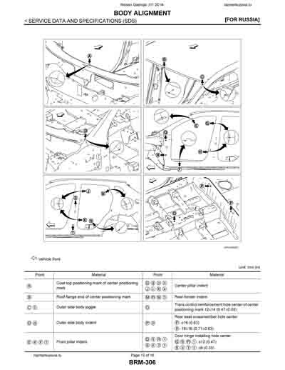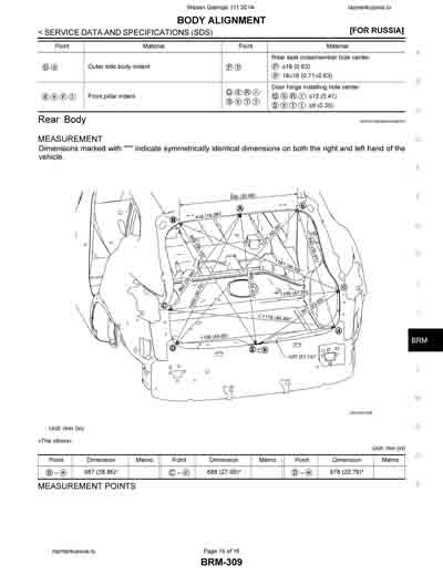 - Из заводского руководства по ремонту кузова Nissan Qashqai Body Repair Manual, в том числе диагональные размеры проемов кузова и контрольные точки геометрии кузова Ниссан Кашкай.