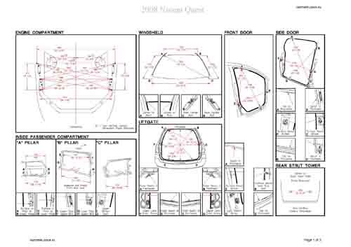 - Геометрические размеры кузова NISSAN Quest (V42) 2003-200, как проекционные, так и непосредственного измерения, в том числе диагональные размеры проемов кузова и контрольные точки для восстановления геометрии кузова.