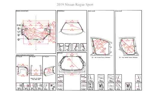 - Геометрические размеры кузова NISSAN Rogue Sport 2017-2019, как проекционные, так и непосредственного измерения, в том числе диагональные размеры проемов кузова и контрольные точки для восстановления геометрии кузова.
