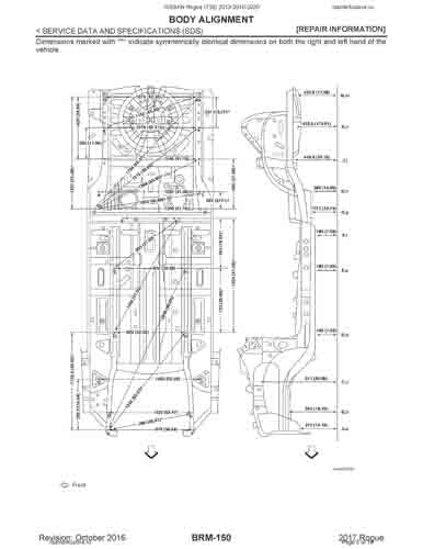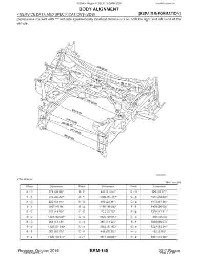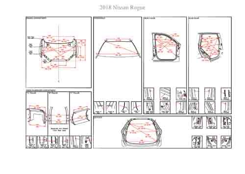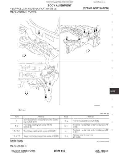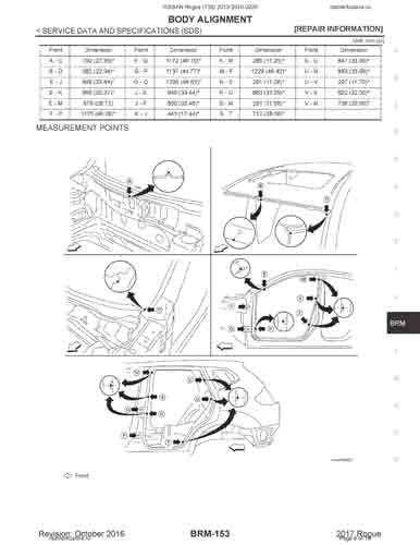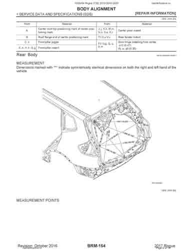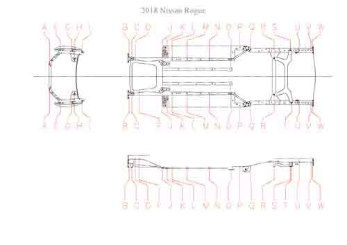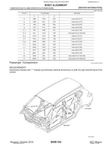 - Геометрические размеры кузова NISSAN Rogue (T32) 2013-2016-2020, как проекционные, так и непосредственного измерения, в том числе диагональные размеры проемов кузова и контрольные точки для восстановления геометрии кузова.