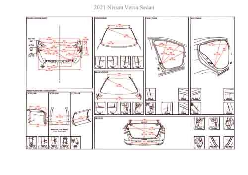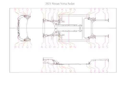 - Геометрические размеры кузова NISSAN Versa 2019--, как проекционные, так и непосредственного измерения, в том числе диагональные размеры проемов кузова и контрольные точки для восстановления геометрии кузова.