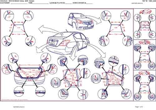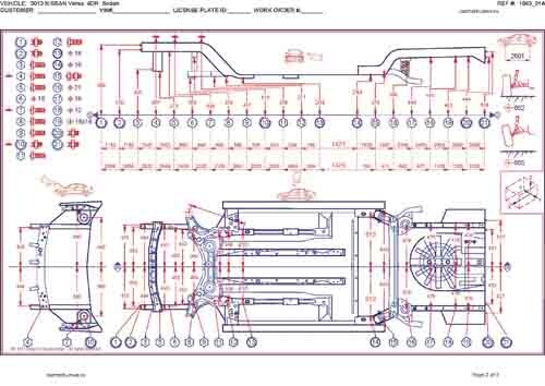 - Геометрические размеры кузова NISSAN Versa (B17) 2012-2017-2018, как проекционные, так и непосредственного измерения, в том числе диагональные размеры проемов кузова и контрольные точки для восстановления геометрии кузова.