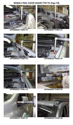 - Проекционные размеры с привязкой к стапелю. Дополнительно приведены цветные фотографии мест расположения контрольных точек Ниссан Икс Трейл на реальном автомобиле.