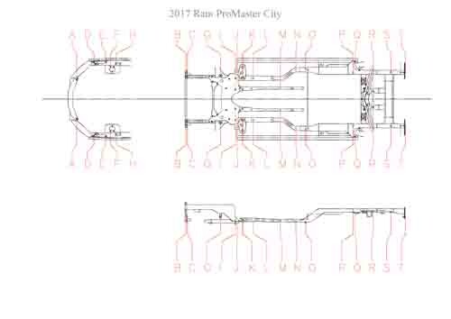 - Геометрические размеры кузова RAM ProMaster City 2015--, как проекционные, так и непосредственного измерения, в том числе диагональные размеры проемов кузова и контрольные точки для восстановления геометрии кузова.
