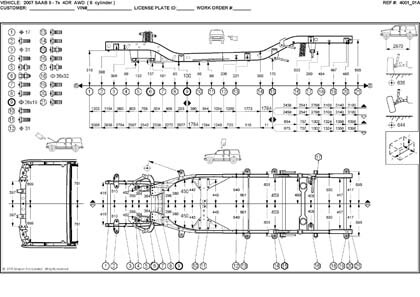 Представлены контрольные размеры кузова для автомобилей SAAB 9-7X- Геометрические размеры кузова SAAB 9-7X, как проекционные, так и непосредственного измерения, в том числе диагональные размеры проемов кузова и контрольные точки для восстановления геометрии кузова.