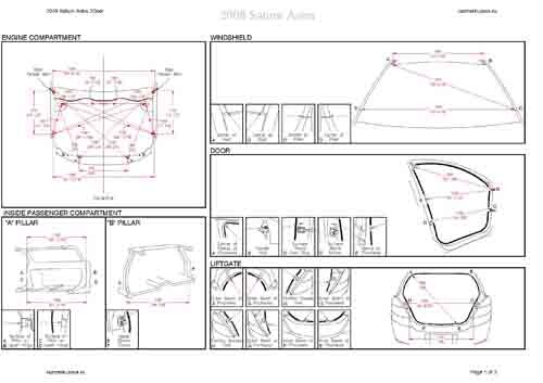 - Геометрические размеры кузова SATURN Astra 2008-2009, как проекционные, так и непосредственного измерения, в том числе диагональные размеры проемов кузова и контрольные точки для восстановления геометрии кузова.