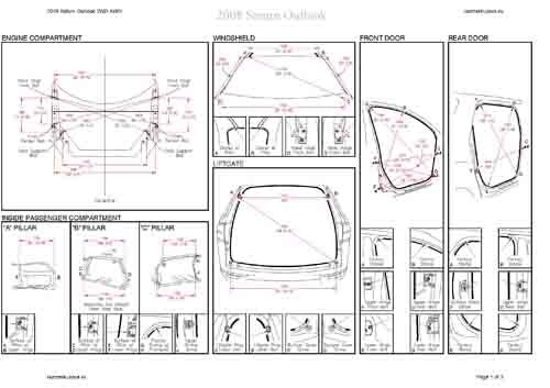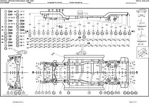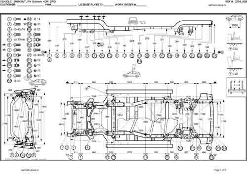 - Геометрические размеры кузова SATURN Outlook 2006-2010, как проекционные, так и непосредственного измерения, в том числе диагональные размеры проемов кузова и контрольные точки для восстановления геометрии кузова.