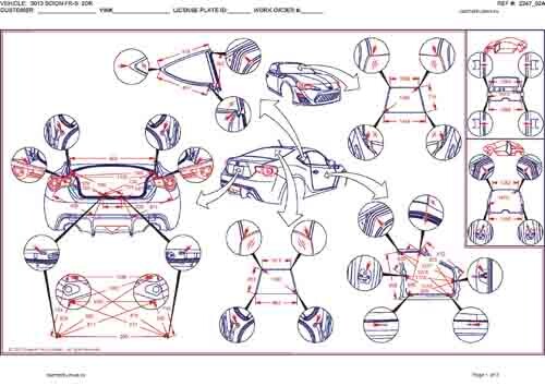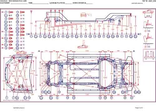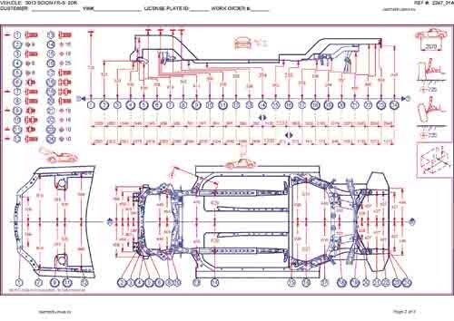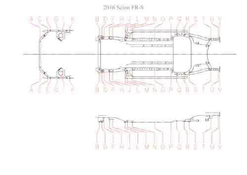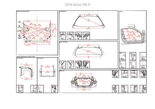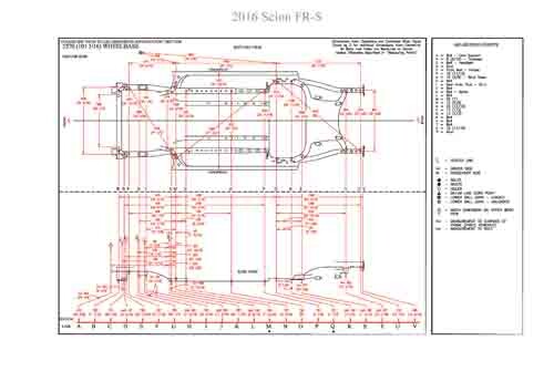 - Геометрические размеры кузова SCION FR-S 2012-2016, как проекционные, так и непосредственного измерения, в том числе диагональные размеры проемов кузова и контрольные точки для восстановления геометрии кузова.