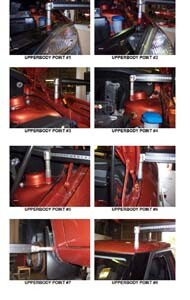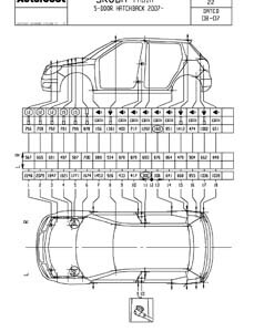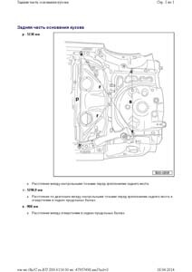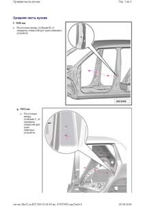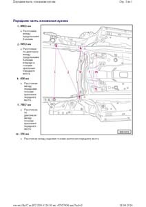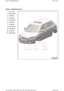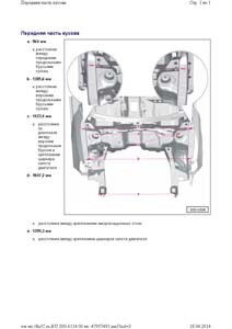 - Проекционные геометрические размеры кузова с привязкой к стапелю. Дополнительно приведены цветные фотографии мест расположения контрольных точек на реальном автомобиле.